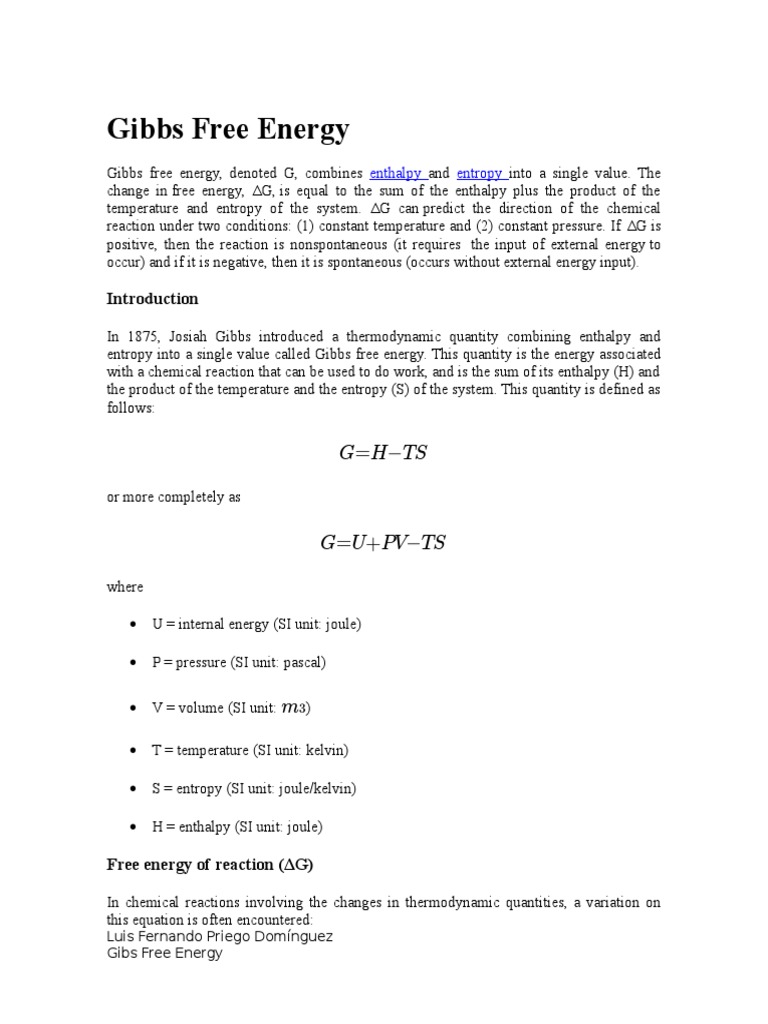 It is defined by the Gibbs equation. Free Energy and Free Energy Changethe Gibbs free energy G is used to describe the spontaneity of a process. Since both are only free energies it makes sense to assign them the SI unit Joule.